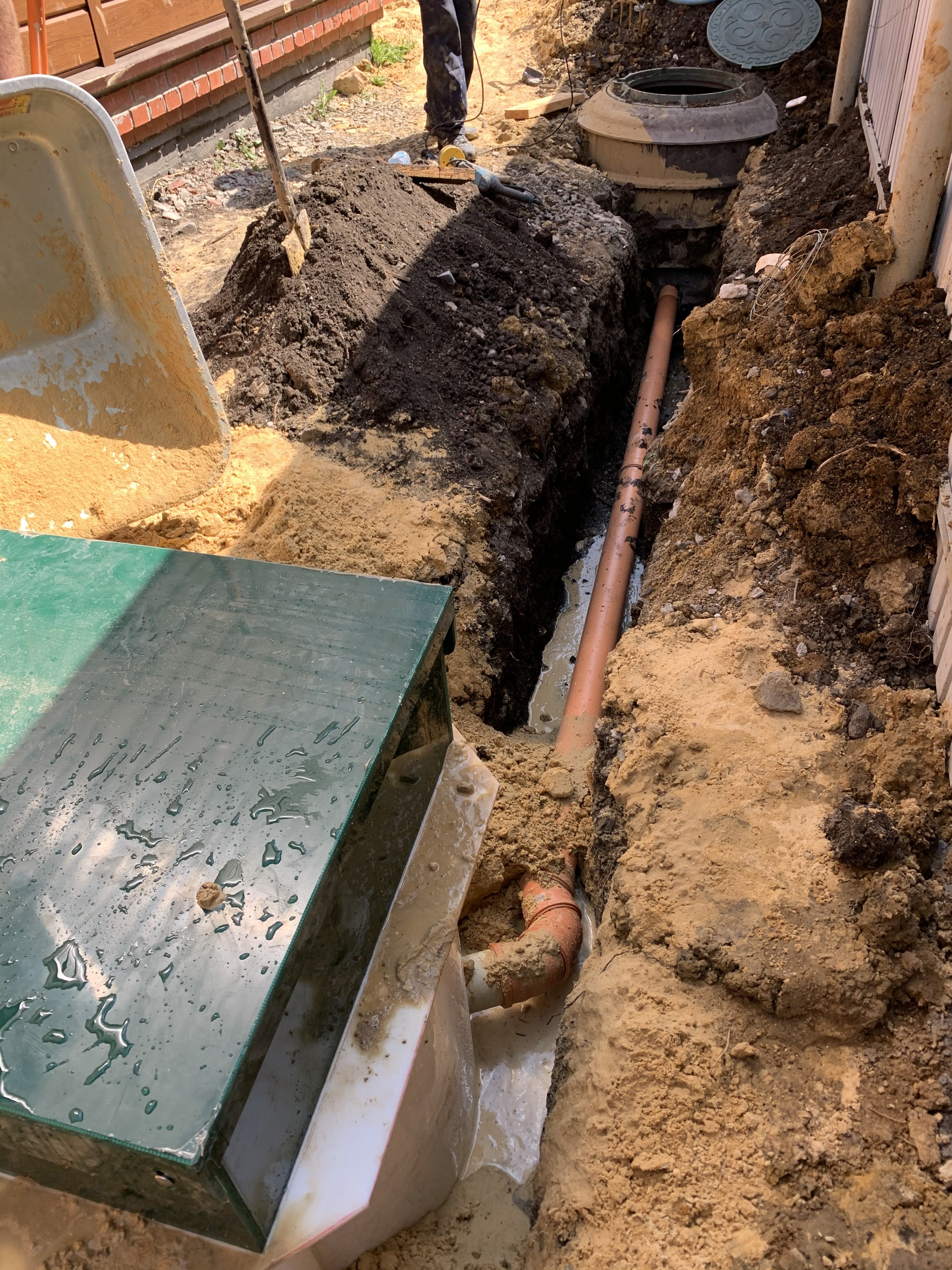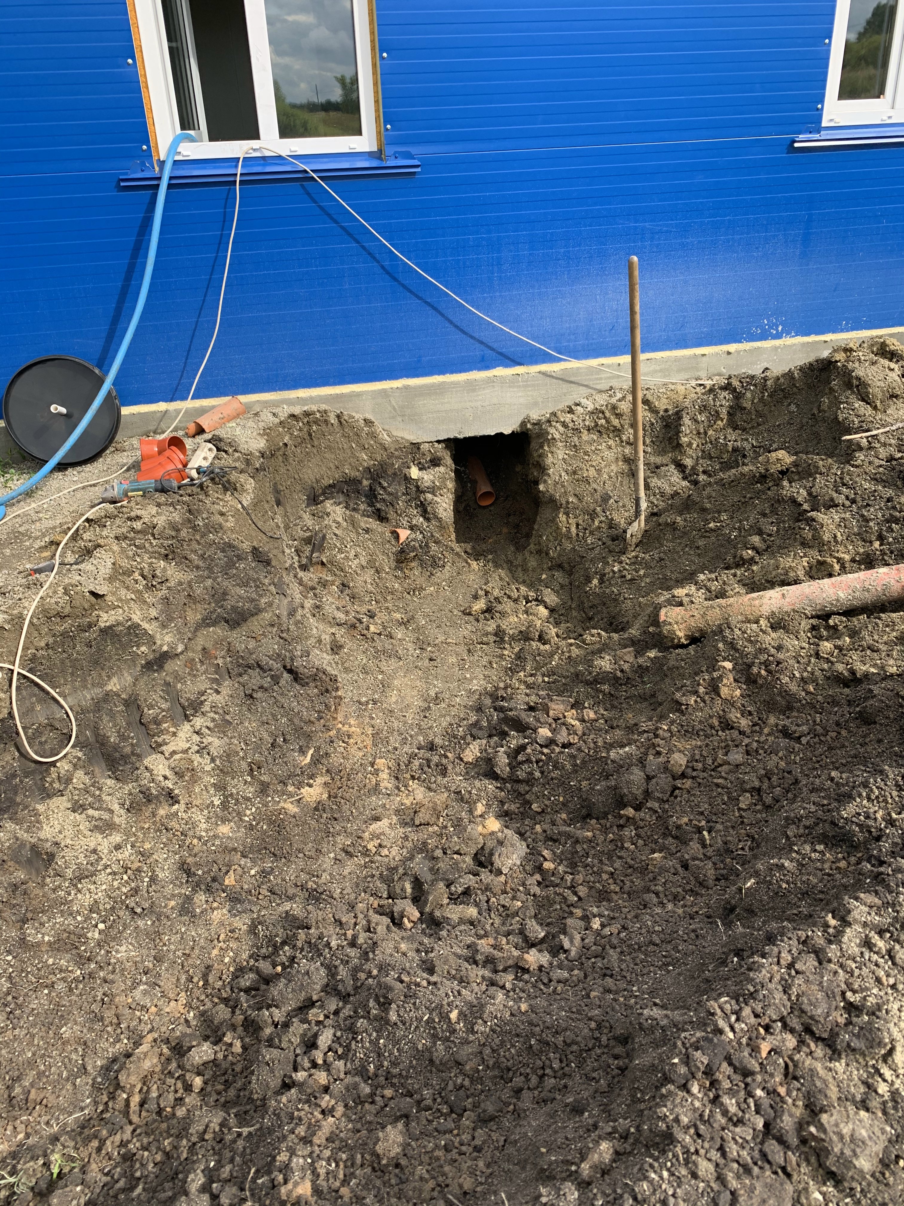 - Роем траншею и укладываем трубу (отводящей или подводящей)