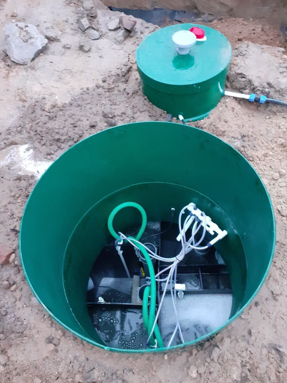 Станция биологической очистки также представляет собой емкость, разделенную на секции. И дополнительно там установлен компрессор или насос для аэрации стоков и более высокой степени очистки - до 98 %. Стоки после станции так же направляются в дренажный колодец, но также могут сбрасываться в грунт или канаву.